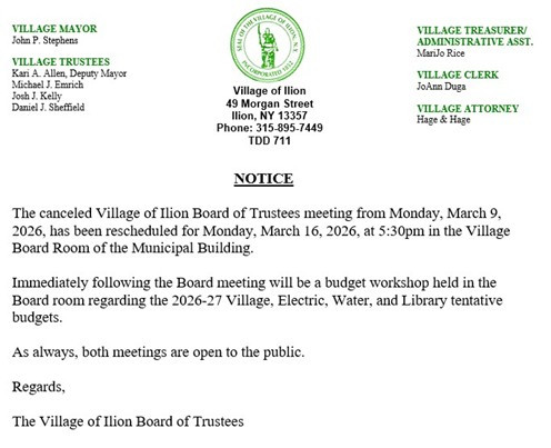 Village Board Meeting will be held at 5:30pm in the Municipal Building Board Room on Monday, March 16, 2026. ** If you require handicap accessibilty, please call the Village Clerk @ (315)-895-7449 Option #4.