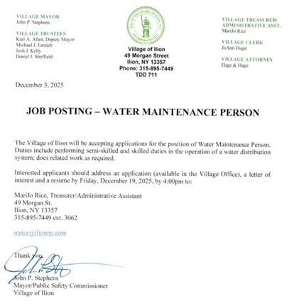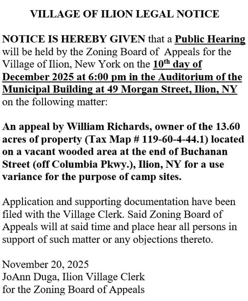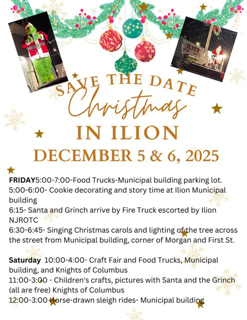 November 10, 2025 – 10:00 am Veteran's Memorial Ceremony in the Ilion Municipal Building Auditorium - all are welcome.
