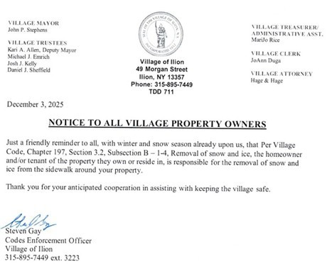 The Village of Ilion is pleased to announce the launching of a Village-wide notification system. The notification system will send voice alerts via cell/landline phones and/or text messages or email during emergency events, including but not limited to; snow emergencies, flash flooding, power outages, and boil water advisories. For information on how to sign up, please click here.